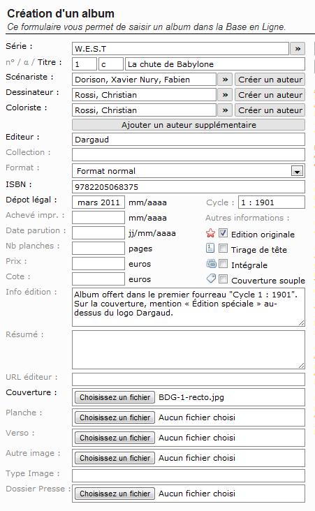 Ah, O.K. -- dommage que chez moi quand je clique dessus il ne se passe rien.jmc95 a écrit:[:fantaroux:2] Un autre problème potentiel : sur les scénaristes, il faut en entrer seulement un dans le champ et utiliser le bouton « Ajouter un auteur supplémentaire » pour le deuxième.