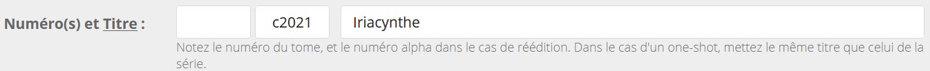 Lors de la création de la fiche, je suis passé par https://online.bdgest.com/album/creation et j'ai rempli la ligne "Numéro(s) et Titre" comme suit :