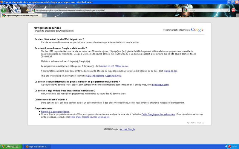Hier, en me connectant le message ci-dessous est apparu. Depuis si je passe par le moteur de recherche Google soit par le marque page de firefox soit en faisant une recherche du site par Google et accès par un lien trouvé ce message apparait!