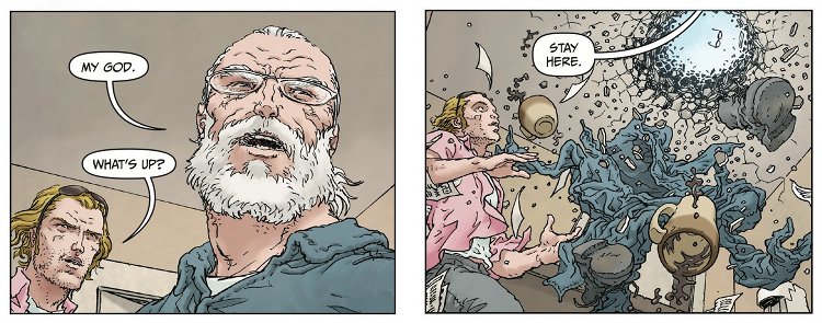 Quant à la narration de Quitely, en grandes cases sans trait de mouvement, elle est tout bonnement impressionnante. Par exemple, il y a une case de décollage de Superman, qui est uniquement rendu par le mouvement des cheveux de Lois, debout à côté. C'est super fort.