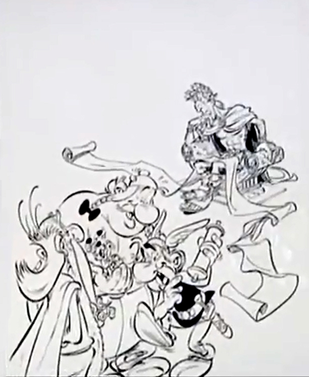 Rappelez-vous, il n'a réalisé que les personnages du fond. Obélix fut réalisé par UDERZO (je le trouve assez mal fait dans sa posture notamment) et Asterix par le studio (il semble figé et mal assis sur son rocher et regarde le public pour créer de la complicité). En fait, le dessin original d' UDERZO est 1000 fois meilleurs avec son Asterix paniqué.