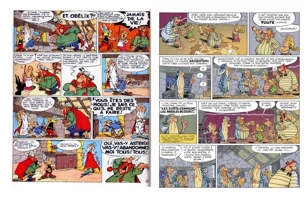 La mise en scène d'Uderzo est très spéciale. Déjà il cadre de loin, donc dessine énormément de trucs. (il s'économise pas comme on dit). Ensuite, il utilise le découpage très dense de Goscinny pour insuffler une dynamique en changeant les angles de vue entre chaque scène. Mais au sein d'une même scène, c'est assez statique. Il y a souvent des redondances de case (action-réaction), et là, la dynamique vient du jeu des acteurs.
