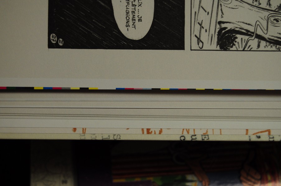 Mon exemplaire ne comprend pas l'exemple que tu mentionnes : quand je l'ouvre à la page 113, c'est-à-dire la planche 27 du cahier des scans, je n'ai pas la "mire" que tu montres.sketch a écrit:Au vu du bord de la planche défectueuse que j'ai photographiée, qui présente une espèce de mire de couleurs, est-ce qu'il est possible de déterminer la technique utilisée?