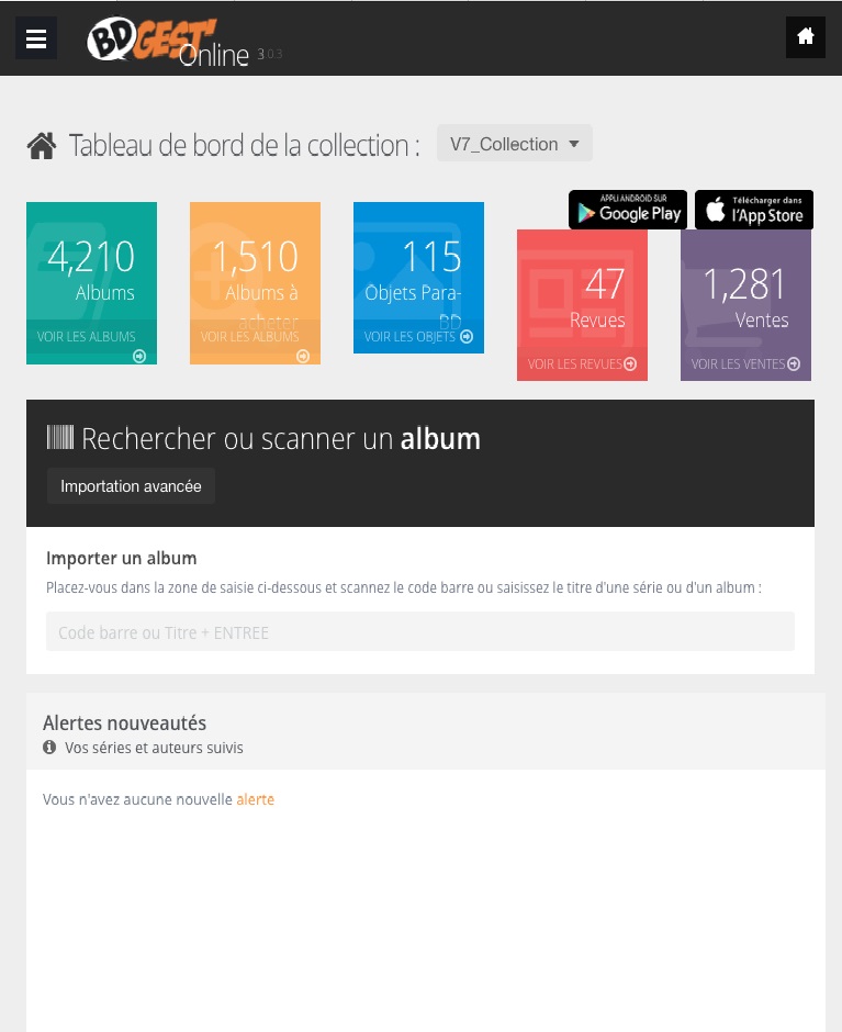 Le changement de collection se fait via le module Paramètres dans l'appli mobile. Dans BDGest Online, il suffit de la sélectionner dans la liste déroulante sous l'avatar.
