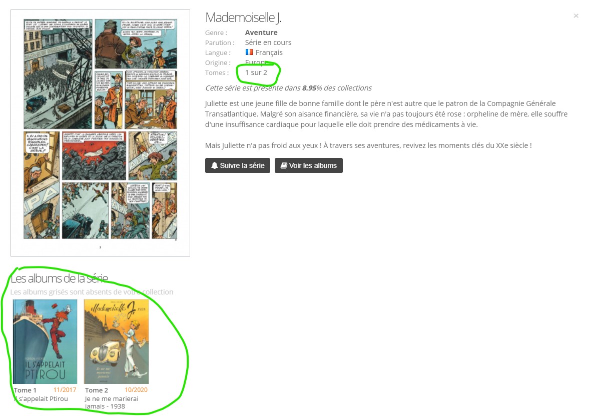 Pour Mademoiselle J. il faut que les 2 album soit rattaché a la série Mademoiselle J. et pas l'un avec Mademoiselle J. et l'autre avec Spirou et Fantasio par... (Une aventure de) / Le Spirou de...