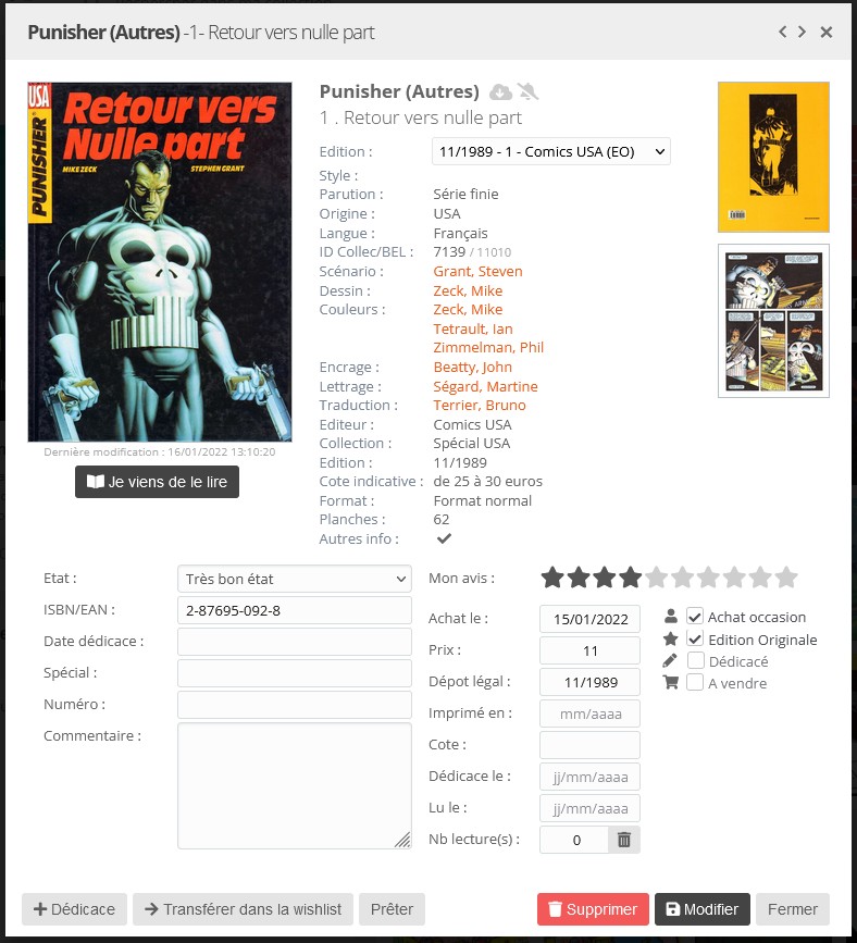 BDGest a écrit:Oui, je pense que la gestion des titres dans la série en se basant aussi sur les titres contenus dans les intégrales est source de confusion. Il serait plus simple de ne comptabiliser que les titres possédés dans les albums "réguliers". D'autant plus que cela impose que chaque intégrale dans la bedetheque soit correctement caractérisée avec tous les tomes qu'elle contient.