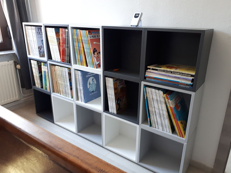à moins d'acheter des cubes de 1, ikea ne propose plus (depuis 1 an à peu près) des étagères eket de 4 avec une profondeur de 25cm ; il faut prendre du 35 cm, et c'est trop pour des BD.