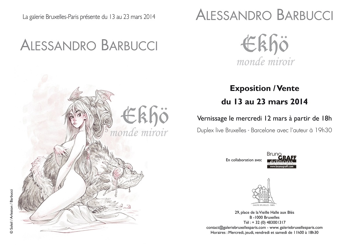 Du mercredi 12 mars 2014 18:30 au dimanche 23 mars 2014L’exposition présentera une sélection de planches originales et illustration issues des univers d'Alessandro Barbucci, Sky Doll & Ekhö monde miroir.