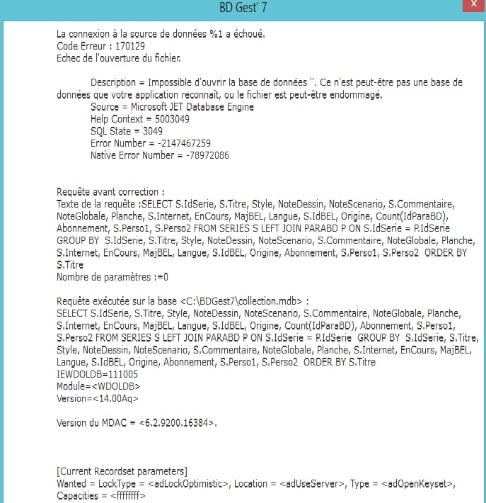 J'utilise BDGest depuis de nombreuses années pour ma plus grande satisfaction. Je viens d'installer l'application sur mon nouveau micro en Windows 8. Pendant les premiers jours tout semblait bien se passer, et voici que ce soir, lorsque je lance le logiciel, le chargement de la liste des albums se passe bien, par contre au chargement de la liste des séries 2 messages plutôt abscons pour moi apparaissent. Pour simplifier j'ai fait des copies d'écran en espérant qu'un expert pourra me dire ce qu'il se passe et comment y remédier.