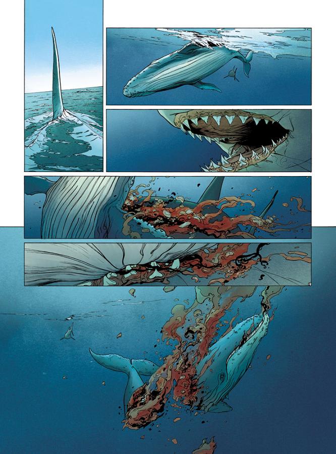 Teddy86 a écrit:J'ai noté ceci mais tu remarqueras que les plans des scènes d'action ne sont pas tous détaillés, comme par exemple on peut voir un mec tomber droit dans la gueule du prédateur, et dans la vignette suivante le requin qui s'eloigne avec un filet de sang filtrant de la gueule (désolé je suis pas expert dans l'argo BD).