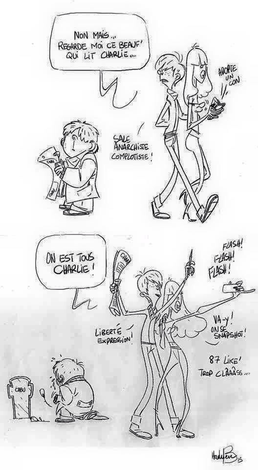En commençant sa marche en tête du cortège, quelques mètres devant les dirigeants du monde entier, l'équipe de Charlie Hebdo a eu un regret. Ils auraient voulu venir en brandissant les caricatures de Benyamin Nétanyahou, du roi Abdallah II de Jordanie, de Nicolas Sarkozy, du chef de la diplomatie russe, Sergueï Lavrov, du premier ministre turc, Ahmet Davutoglu, de tous ces chefs d'Etat et de gouvernement inégalement démocrates dont ils se sont gaussés pendant des années.