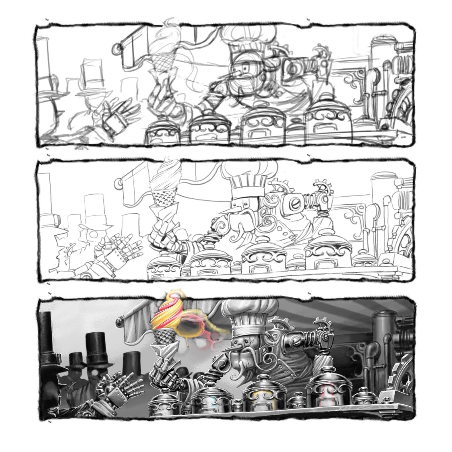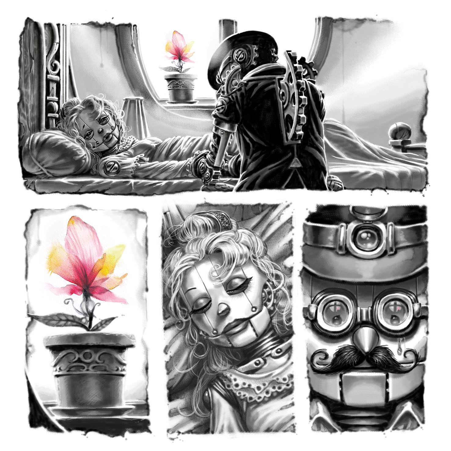 L'univers steampunk est celui de petits pantins mécaniques qui vivent dans un monde en noir et gris. Les seules manifestations de couleurs proviennent de leurs émotions et de ce qui échappe à la rationalité.