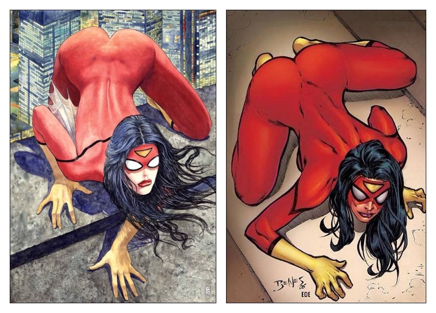 Il y a des tonnes de couvertures et de cases dans l'industrie des comics qui représentent des héroïnes dans des postures très sexualisées, de façon peu réaliste (et que je me cambre bien au milieu du combat.....), je ne vois pas en quoi celle-là est "pire" - si l'on met à part la réputation du dessinateur (mais c'est peut-être tout simplement de ça qu'il s'agit ?). Et pour le coup, la posture de Spider-Woman, penchée vers l'avant, fesses en l'air et jambes écartées, est une posture qu'on voit fréquemment prendre son homologue masculin. :siffle: