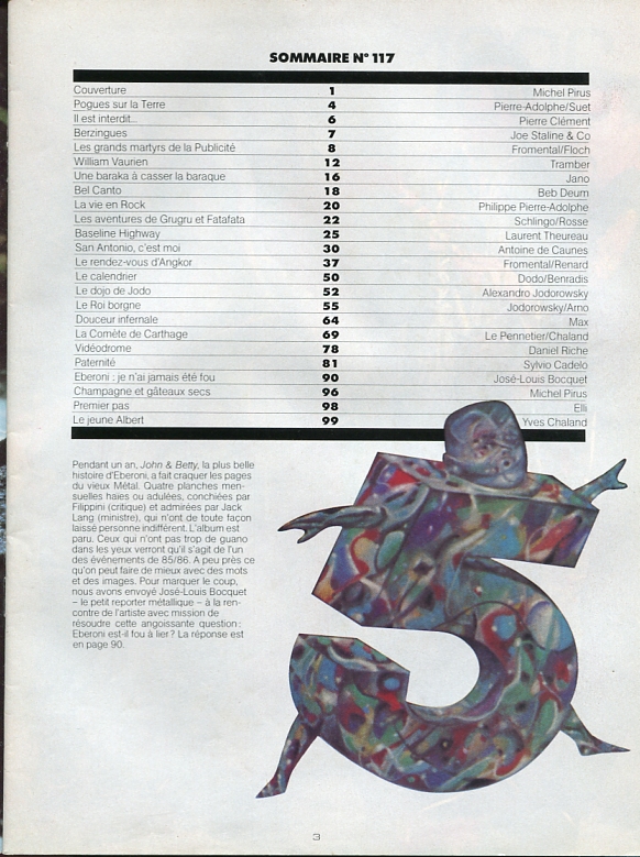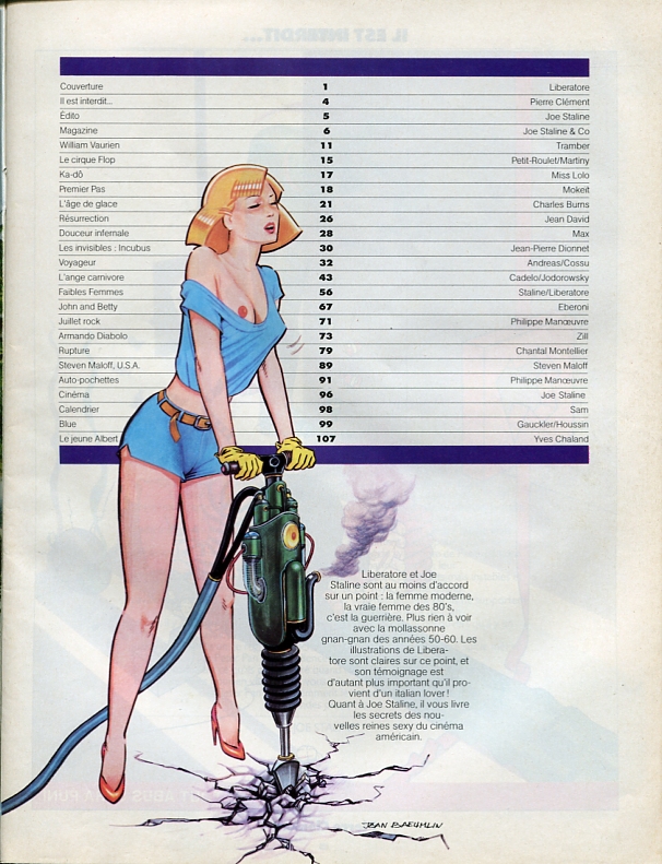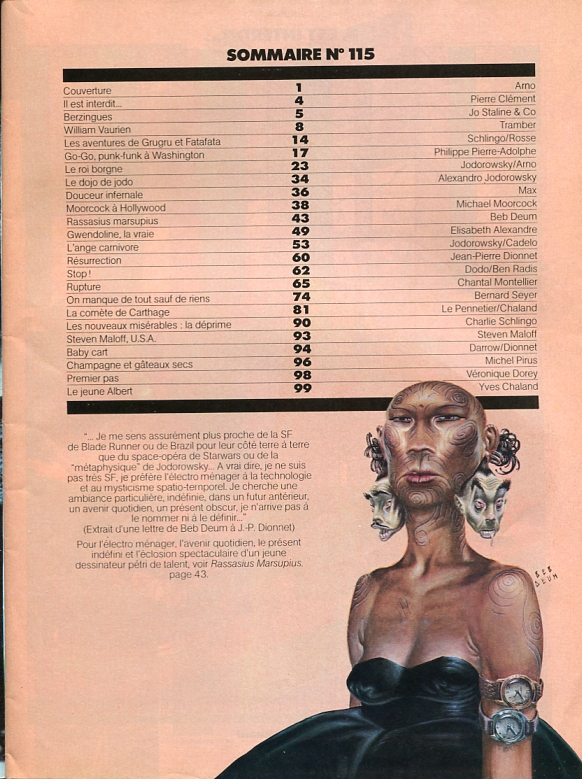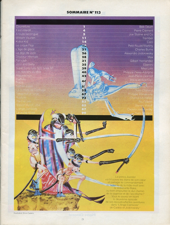 Couverture Moebius. Page 1 "Approche sur centauri" Philippe Druillet/Moebius. Page 9 "Rut" Philippe Druillet. Page 12 Rédactionnel Jean-Pierre Dionnet. Page 14 "Split le petit pionnier de l'espace" Moebius. Page 17 "Arzach" Moebius. Page 25 "Agorn" Philippe Druillet. Page 41 "C do Pey" Richard Corben. Page 49 "Les mystères de l'érotisme" Moebius. Page 50 Chronique avec porte-jarretelles (rédactionnel) Major Grubert. Page53 "Les armées du conquérant" Jean-Pierre Dionnet/Gal.