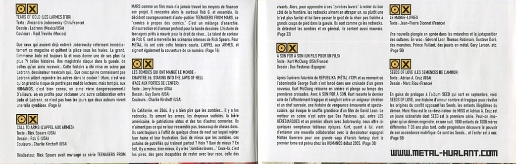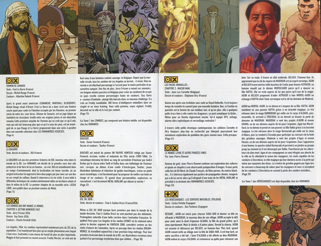 Couverture Stéphane Oiry. Page 3 "Masters of destiny" Alexandro Jodorowsky/Adi Granov. Page 17 "The zombies that ate the world" Jerry Frissen/Guy Davis. Page 29 Le mange livres (rédactionnel) Jean-Pierre Dionnet. Page 34 "Les passe-murailles" Jean-Luc Cornette/Stéphane Oiry. Page 45 "La dernière frontière" Fred Le Berre/Francis Ferlet. Page 59 "Les hérésiarques" Carlos Portela/Das Pastoras.