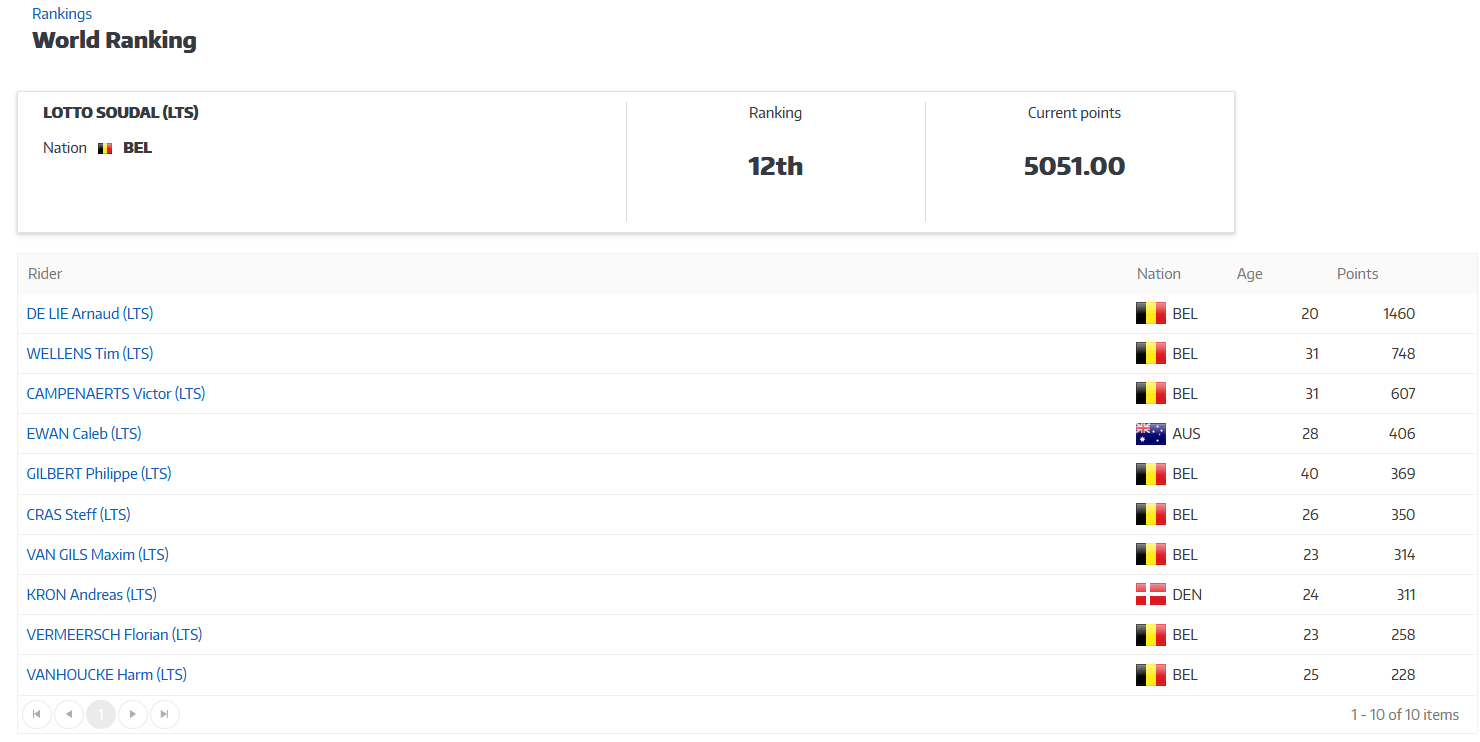 Et le classement qui compte pour la relégation totalise les saisons 2020 + 2021 + 2022. Et là Lotto est 19ème et avant-dernière World Tour...