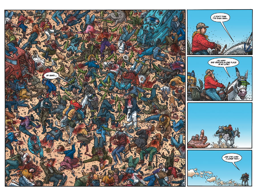 Darrow exploite l'objet BD pour réaliser parfois de véritables fresques où les modèles sont plus proches de Sid Vicious que d'un Apollon de Michel-Ange.