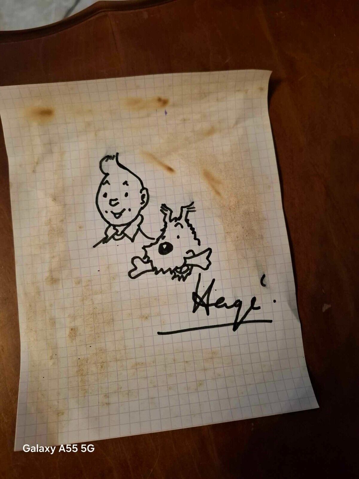 Bonne pioche ! Et moi, je suis absolument convaincu par l'argumentation: "je tiens à préciser que je l'ai trouvé chez ma mère après son décès , je ne sais pas s'il est authentique , mais je peux vous dire que mon grand-père était pilote de ligne et qu'il voyait souvent Mr Hergé dans son avion qui dessinait pendant ses voyages donc peut-être qu'il a eu ce dessin avec lui mais je n'ai aucune preuve ."