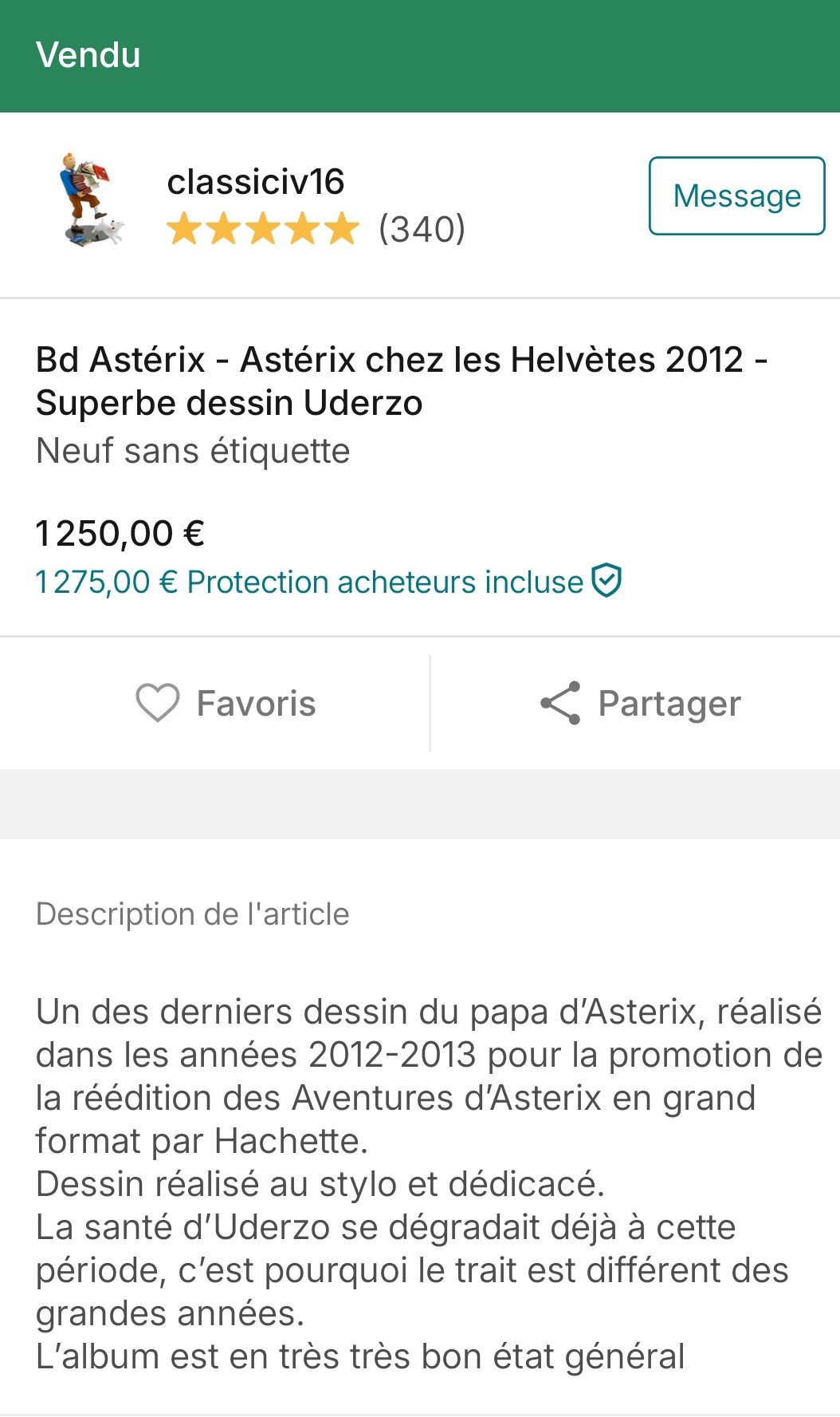 Je vous écris, car ce matin, cette dédicace de Uderzo sur vinted m'a questionné, ainsi que les explications du vendeur. Cet article est parti en à peine 5 minutes.