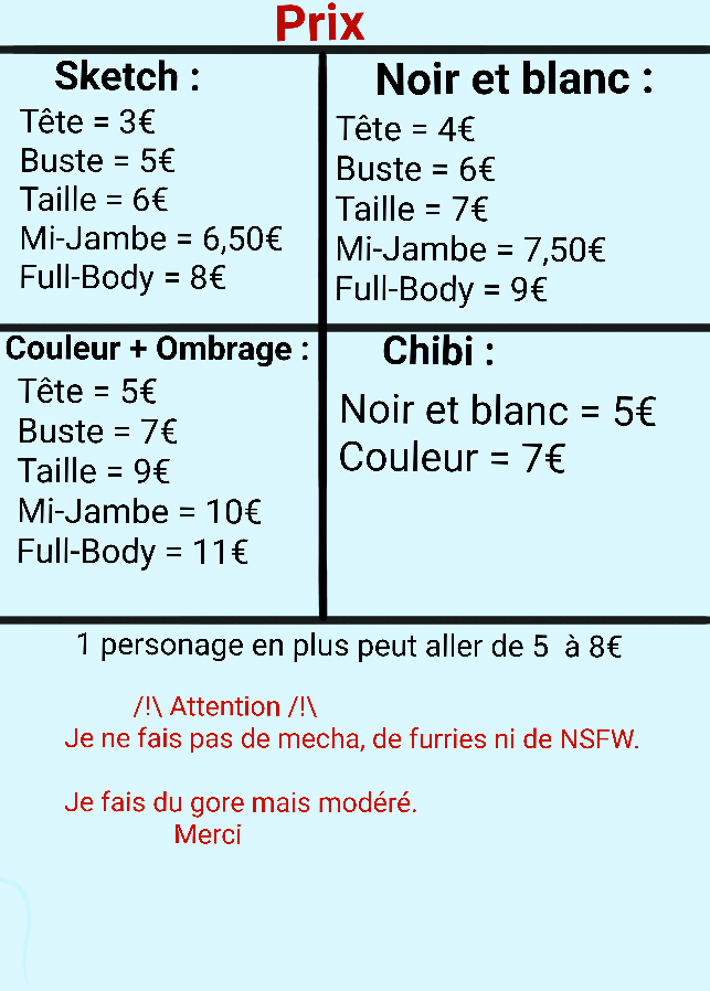 Bonjour je suis dessinatrice amatrice, je réalise des commissions.