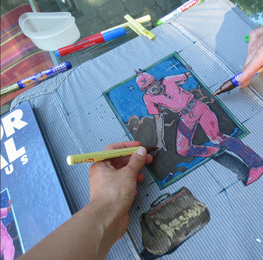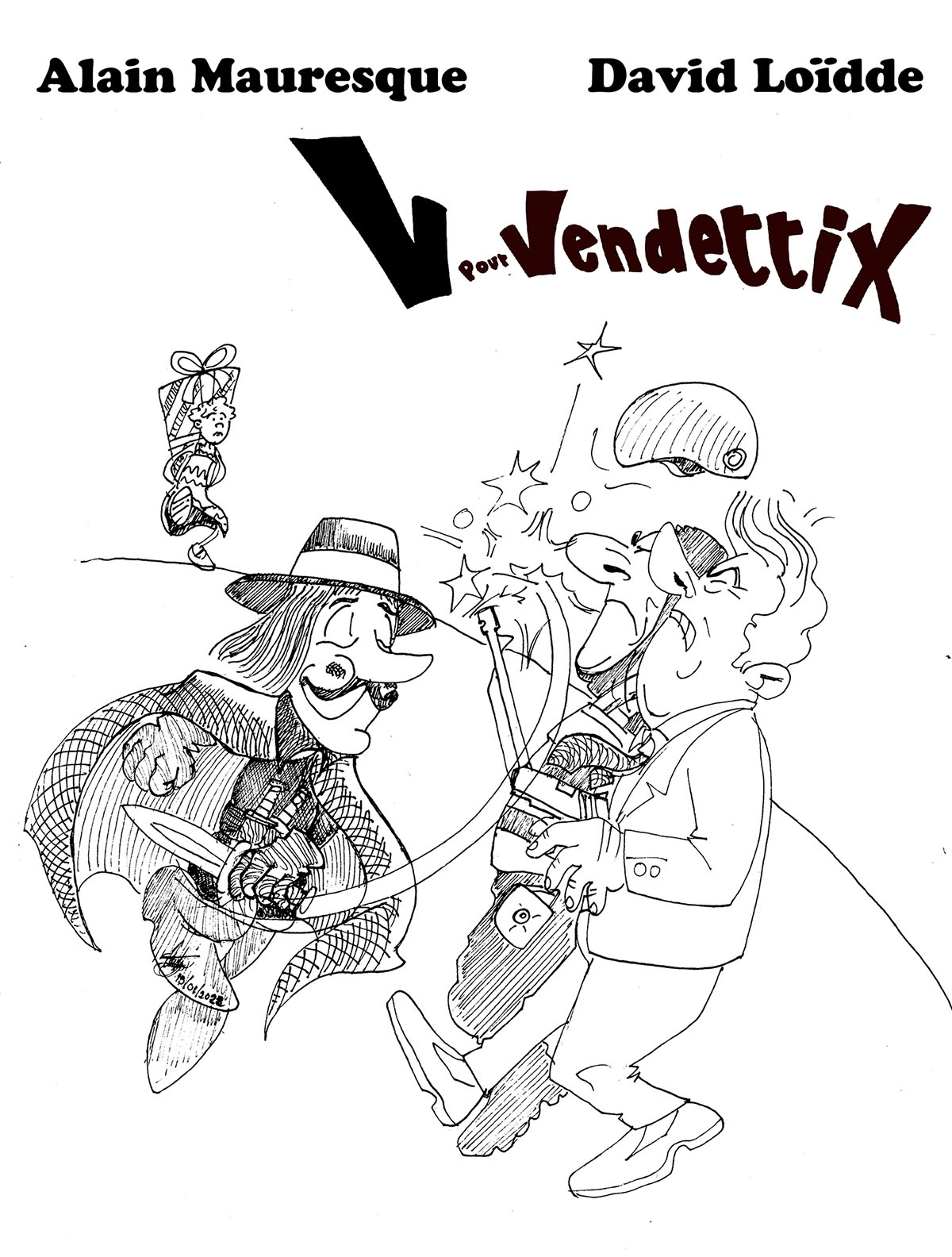 Alors, je me suis trompé et avait mis le dessin avec Grubert et Tintin dans le forum de bds franco-belges (desolé!). La premiere image est un melange de V Pour Vendetta et Asterix. La deuxieme image est une petit parodie/hommage de Moebius et Herge.