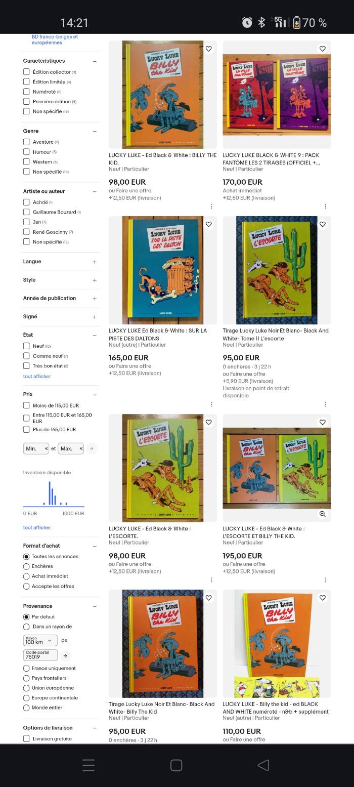 Distinguo souvent évoqué effectivement... mais malheureusement (pour les acheteurs), dans le cas qui nous intéresse, une petite recherche approfondie des "ventes réussies" des Lucky Luke Black & White montre des prix tout aussi prohibitifs pour les achats conclus...
