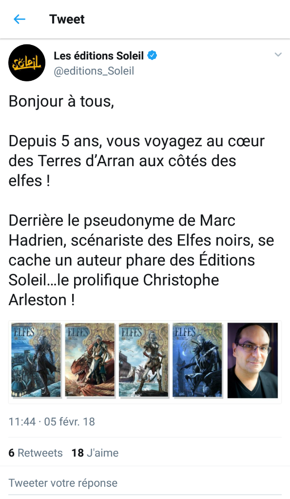 une info surprenante sur FB de l'éditeur ce matin : Hadrien le scénariste des elfes noirs est le pseudo....de ....Arleston!