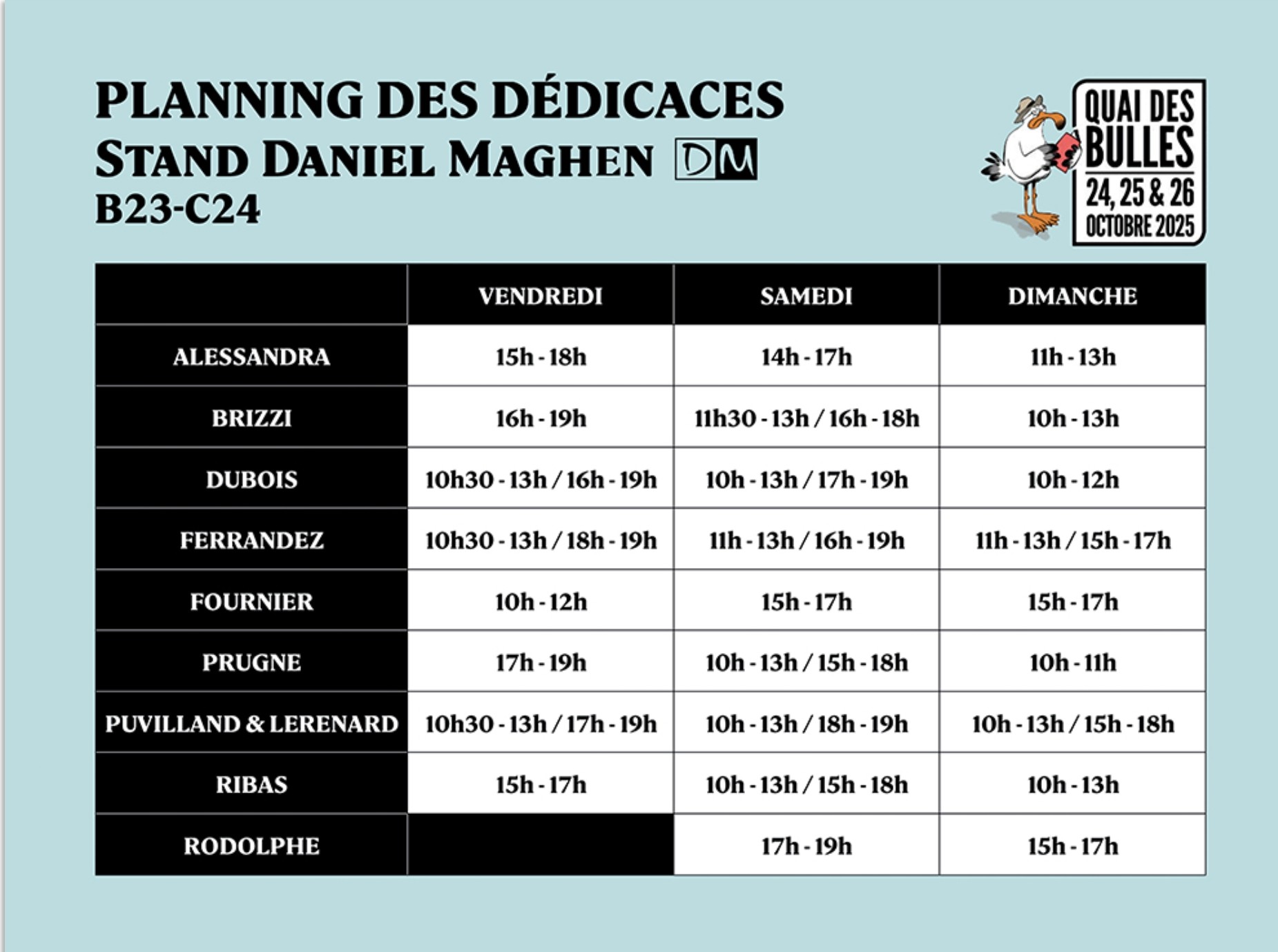 - À 12h00 pour les séances de dédicaces entre 13h30 et 17h30