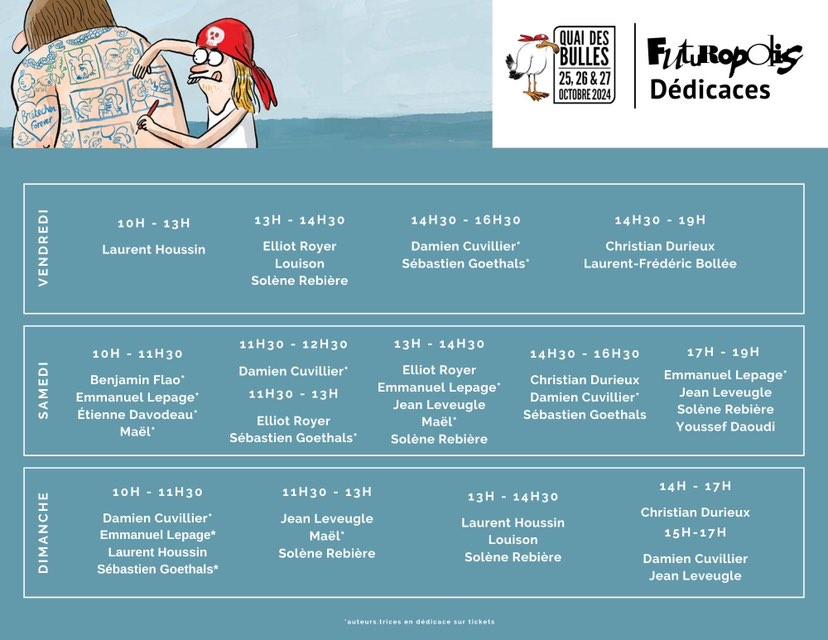 Je sais que vous avez dit et mentionné pour les enfants mais moi ma fille à 8 ans et clairement 3jours de festival loin de chez nous ça fait trop pour elle ( déjà qu'une journée au penn ar bd c'est dur :s ) et si on montre carnet de famille avec imposition de la signature au nom de l'enfant ça serait jouable pensez vous ? Après si pas possible y a pas mort d'homme lol et j'achèterais plus tard les BD visées![]()