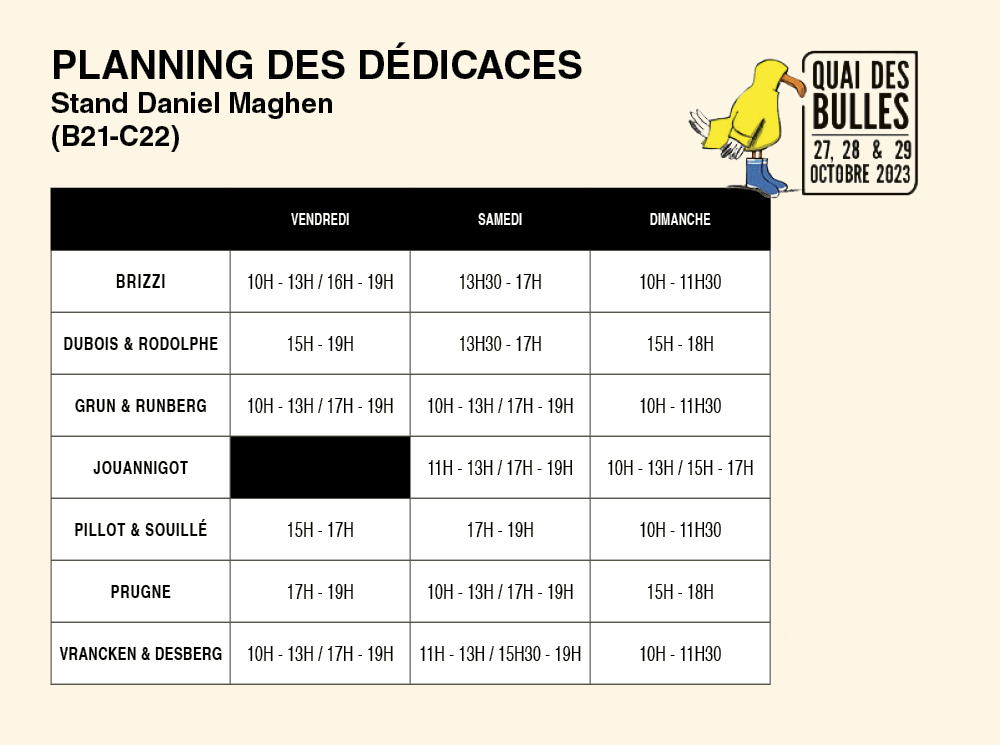 - Si vous êtes tiré au sort, nous vous demanderons l’achat d’un livre de votre choix sur notre stand (pas forcément un album à dédicacer)