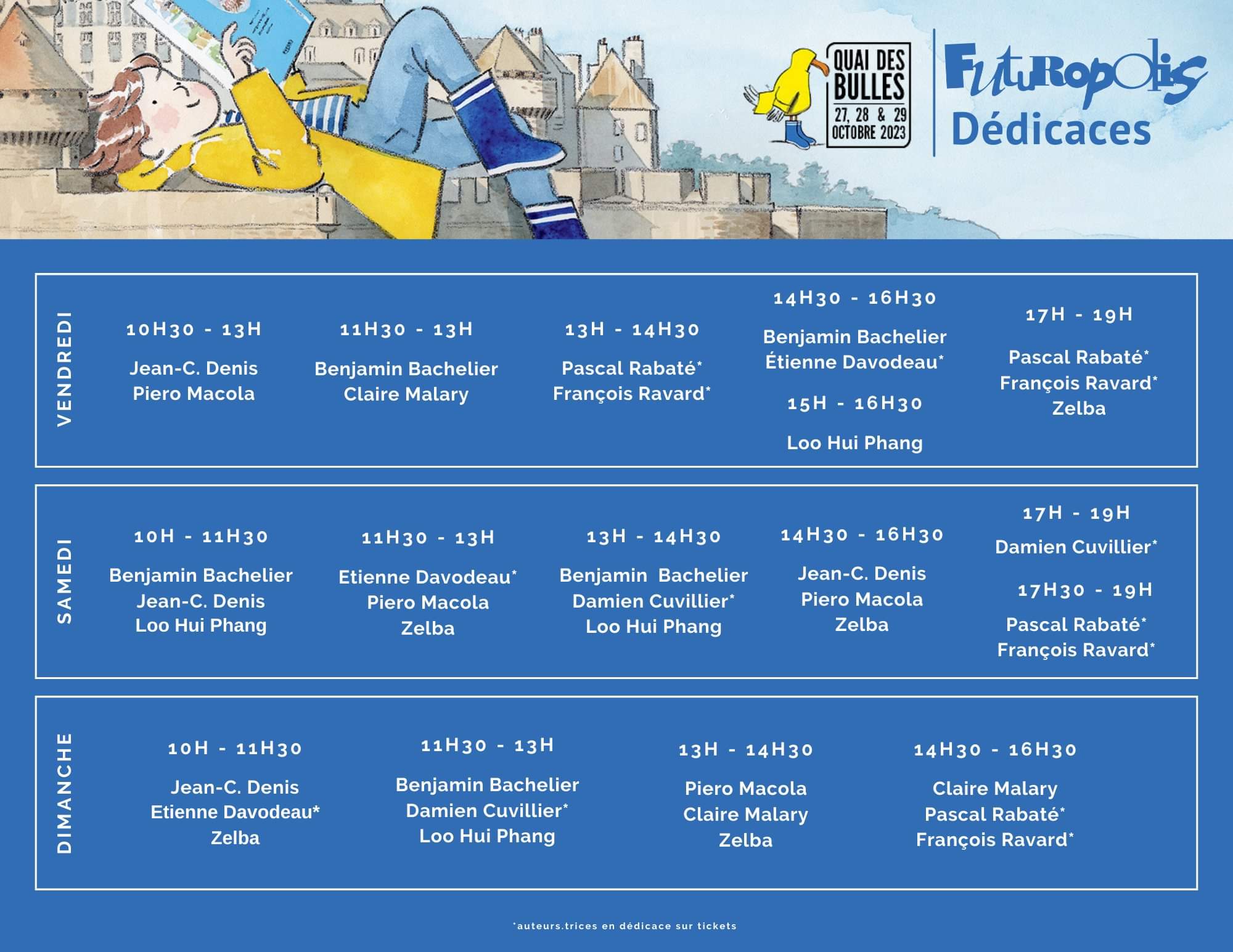 Tirage au sort pour les auteurs suivants : Stefano Carloni, Oliver Taduc, Enrico Marini, Merwan, Dany, Djet, André Le Bras, Benoit Dellac, Stéphane Crety, Robin Retch. 1h avant le début de la séance, les gagnants seront contactés par SMS pour venir retirer leur ticket de dédicace.