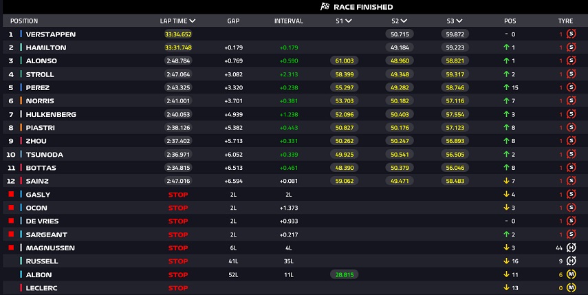 bdmaniak a écrit:Une ligne droite et Sainz finalement dernier, Gasly ça le démange de s'en prendre à Ocon, elle va super, l'ambiance chez Alpine.