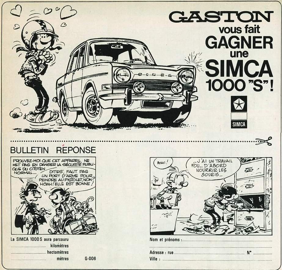 lusabets a écrit:Arf ! Sans vouloir passer pour un obsédé de la vroum-vroum, l'on voit dans le graphisme de cette Simca Mimile que Franquin ( ou Jidéhem ? ) assure côté dessin de bagnole, contrairement à qui vous savez !