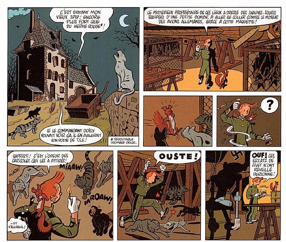 C'est pour cette raison que je me suis fâché avec Yann et Schwartz, lorsque dans l'album Spirou en vert-de-gris, Spirou met des coups de pieds à un groupe de chats lorsqu'il entre dans une grotte. J'avais lu ça dans le journal de Spirou lors de la pré-publication, je ne sais plus en quelle année ( il y a bien un petit futé qui va nous rappeler l'image sur ce fil... Merci à lui ) . Évidemment, je n'avais pas acheté l'album au moment de la parution ( à l'époque, j'avais regardé dans l'album si cette image avait bien été publiée, hélas si ). J'avais fait la remarque sur le forum en son temps (avec levé de bouclier habituelle de certains). Car, lorsque l'on connait un tant soit peu les chats, il est inutile de vouloir donner des coups de pieds aux matous, ces derniers, devant un truc inconnu, prudemment, ils se sauvent très vite.