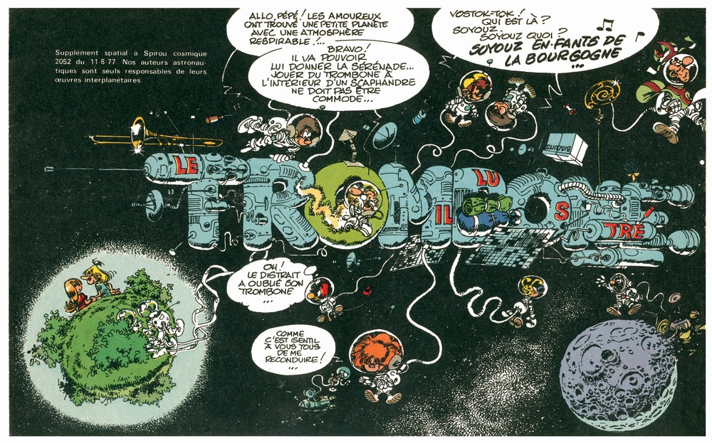 Et Franquin avait rendu l'illustration en retard, Delporte avait gueulé parce qu'au lieu de peindre en noir comme n'importe quel humain normalement constitué, Franquin avait travaillé son ciel étoilé point par point. Juste parce que ça faisait mieux selon lui.