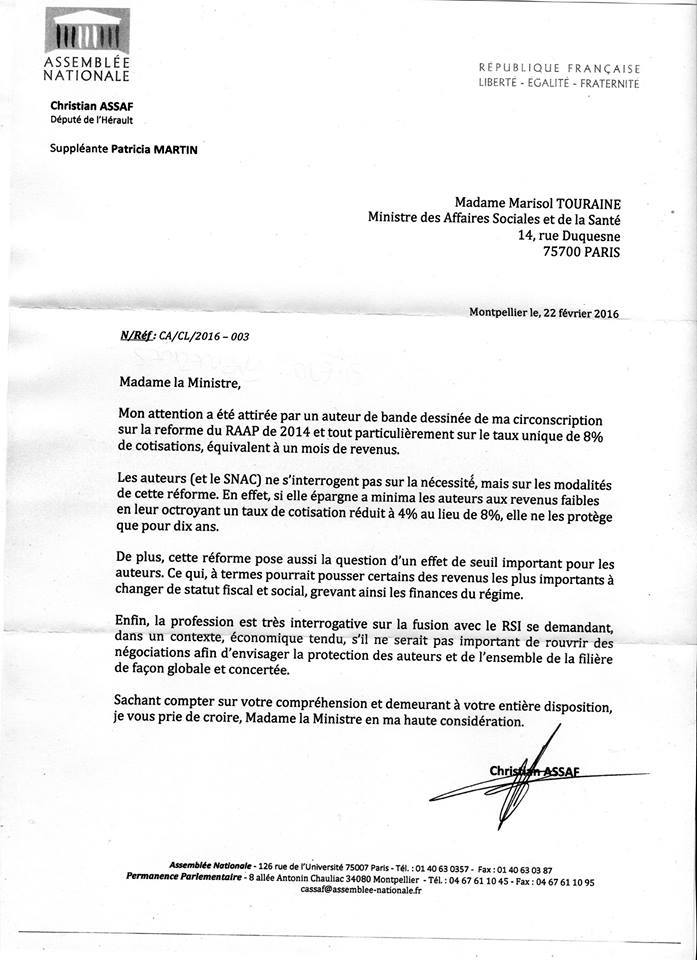 suite au decret signé le 30 Décembre, j'ai demandé rendez-vous au député de ma circonscription (qui plus est, detaché au finances au niveau national), que je savais particulièrement attaché à la BD (aide et soutien au festivals du coin). J'ai eu rendez-vous avec lui le 22 Février, lui ai expliqué notre problème avec le RAAP. Le taux de 8% l'a effectivemment choqué, je lui ai également parlé de la précarisation de notre profession, chiffres des états généraux aidant. Il a promis d'écrire à la ministre (promesse tenue, voir la lettre ci-jointe) mais aussi aimerait poser une question au gouvernement, mais pour cela, il faudrait que d'autres députés se joignent à lui. Une quarantaine serait bien (peu importe l'étiquette)