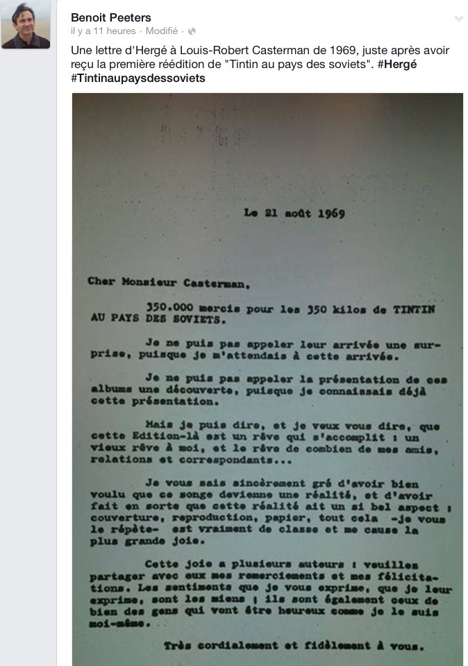 Lettre du 21 août 1969 de Hergé à L.R.Casterman (reproduite par Benoït Peeters ci-dessus dans ton post)