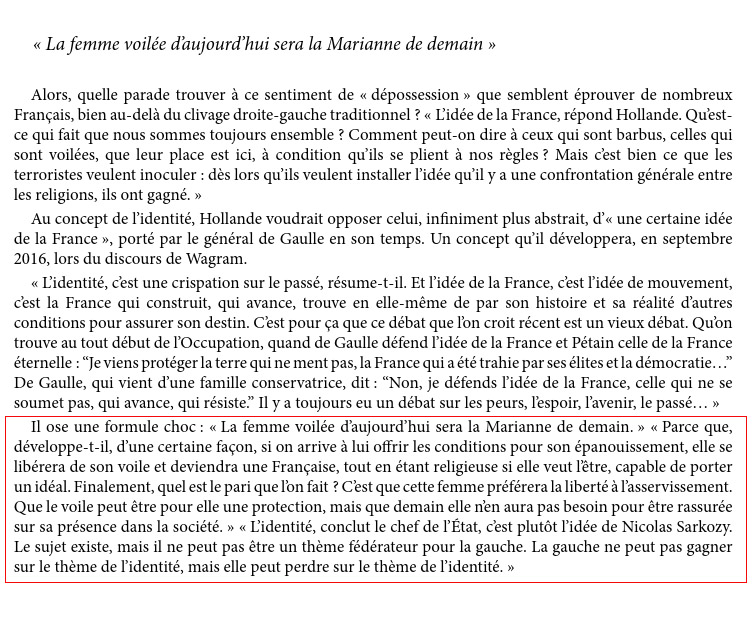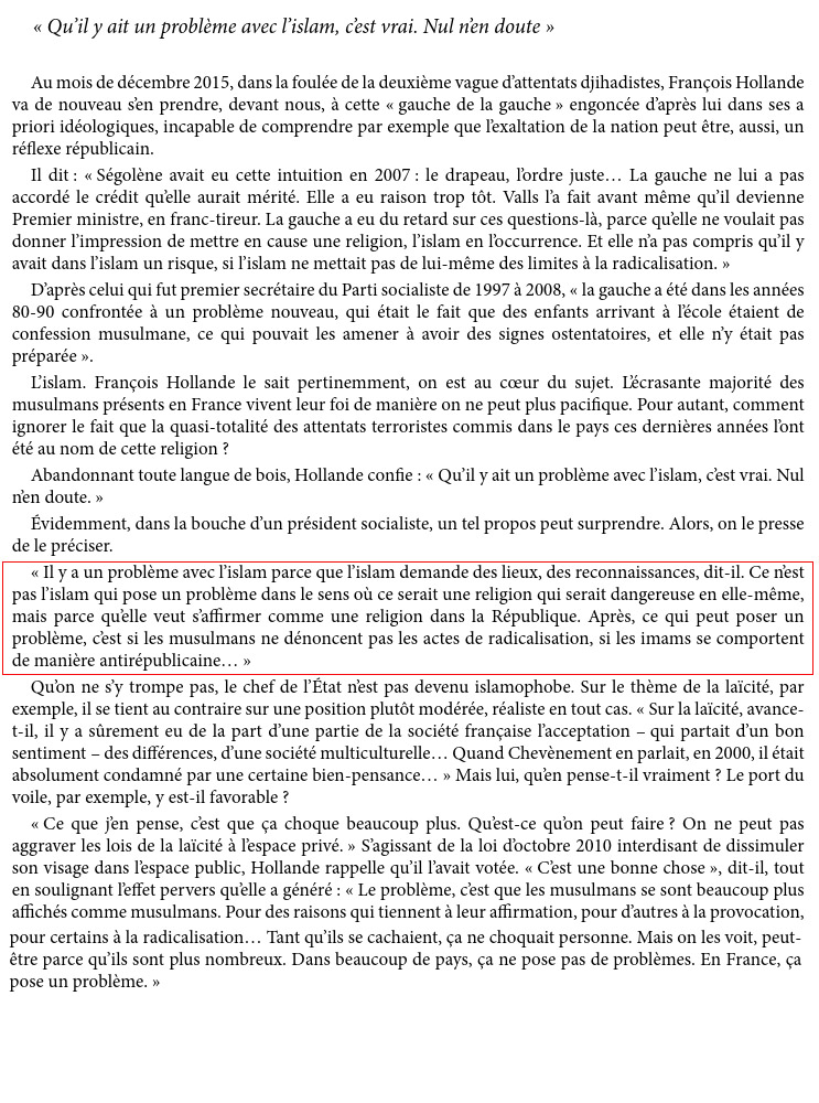 Abandonnant toute langue de bois, Hollande confie: "Qu'il y ait un problème avec l'islam, c'est vrai. Nul n'en doute." Evidemment, dans la bouche d'un président socialiste, un tel propos peut surprendre. Alors, on le presse de le préciser. "Il y a un problème avec l'islam, parce que l'islam demande des lieux, des reconnaissances, dit-il.