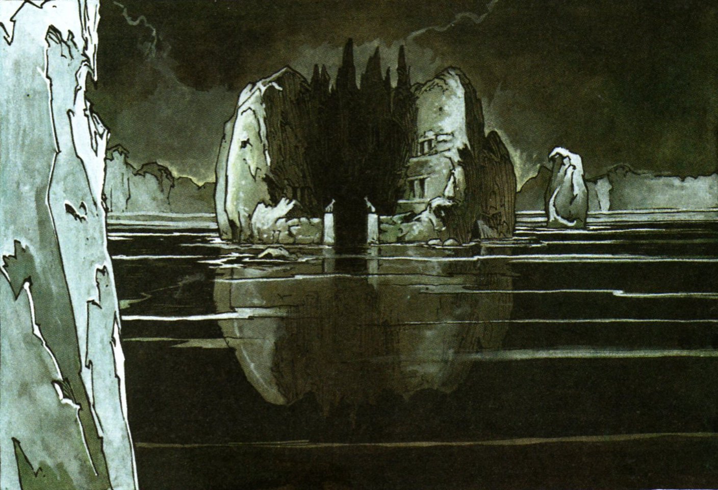 Ah bah déjà, la version sans titraille nous donne à voir une réinterprétation de L’Île des morts d’Arnold Böcklin, une peinture célèbre. Ou plutôt, une série de peintures, puisque Böcklin réalisera cinq versions à la fin du XIXe siècle, pour des commanditaires différents (l’une d’elles sera détruite dans un conflit). La série est souvent commentée comme étant une représentation de la solitude de l’artiste mais également de son caractère privilégié.
