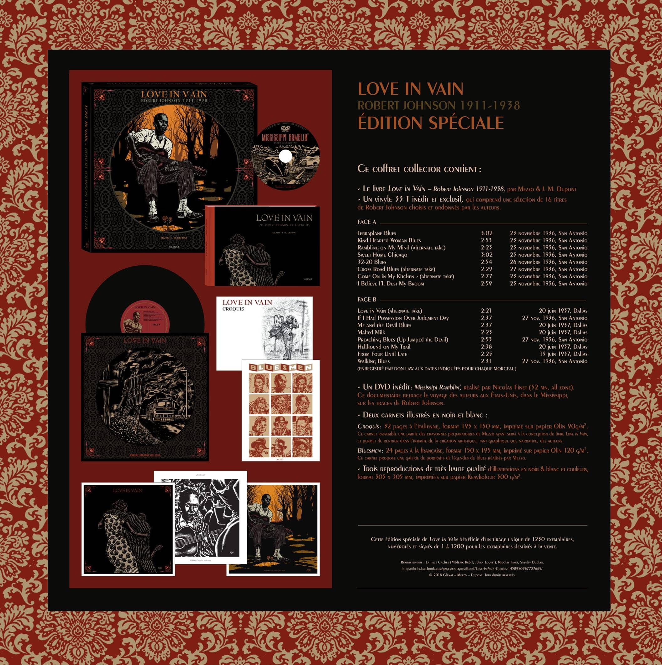 Cette édition limitée comprend donc le livre, un disque vinyle 16 titres de Robert Johnson (dont la conception graphique est assurée par Mezzo , pochette et étiquette centrale), le DVD du documentaire "Mississippi Ramblin'" réalisé par Nicolas Finet, 2 carnets de croquis et 3 illustrations format 305 x 305 mm.