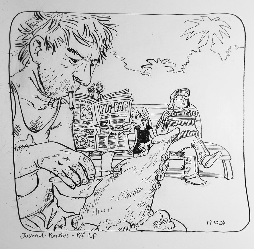 . J'aime bien la composition générale et les petits détails, notamment notre cigale préféré en dernière page de Pif-paf