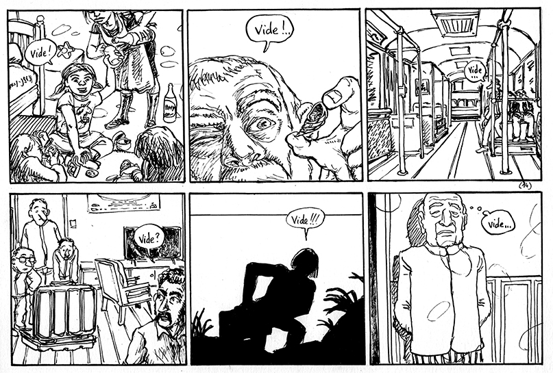 Et juste ajouter un accent aigu dans cette dernière bulle, peut-être, pour faire "Vidé..." ? Qu'en penses-tu ? Ça marquerait peut-être un peu plus la chute, je sais pas...