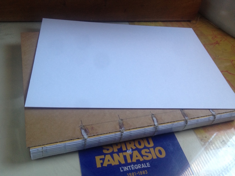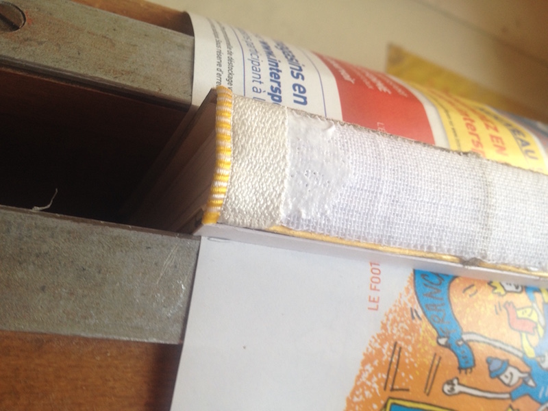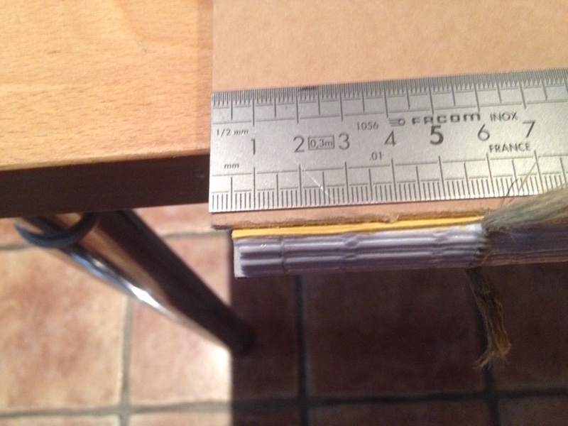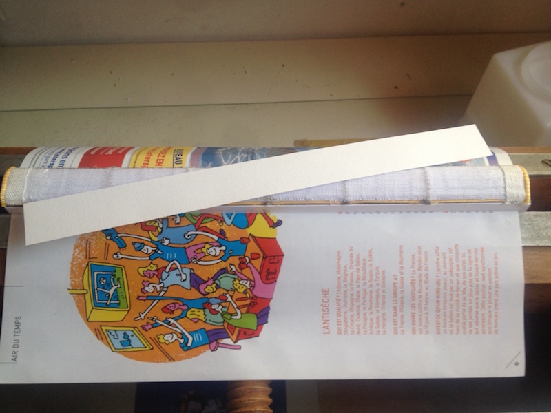 Pour palier à ça et assurer du même coup l' alignement de l 'ensemble de la couverture (c 'est à dire des deux plats), on va mettre en colle les ficelles supérieurs.