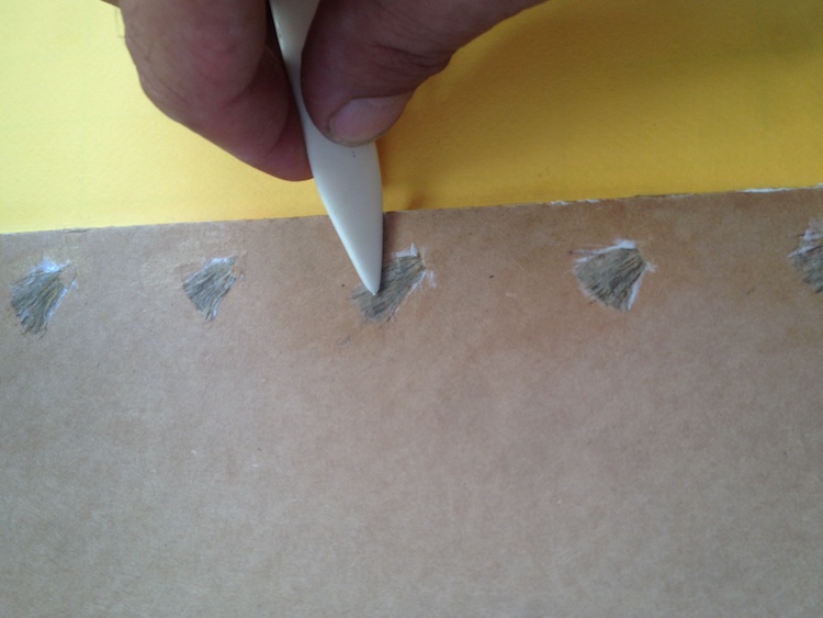 Une fois tout vérifier , vous étalez la colle avec votre pointe en os et ce que je fais moi , c'est mettre quelques coups de marteau pour commencer à bien aplanir les ficelles .