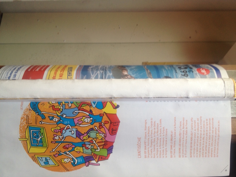 On met le livre sur le bord d 'une table tout en laissant pendre le premier plat . On l 'enduit de colle .