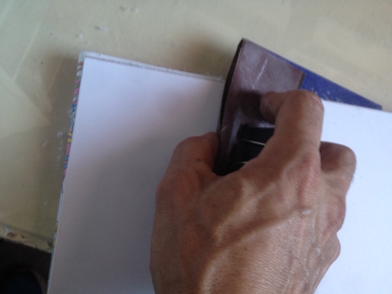 Planche et mise sous poids , pour ma part , je met le livre sur le bord de la table , je mets une planche et finalise le serrage par deux serre joints au niveau des ficelles fraîchement collées. (j' utilise des serre joints en plastique , vous savez ceux que l 'on pompe pour les serrer).