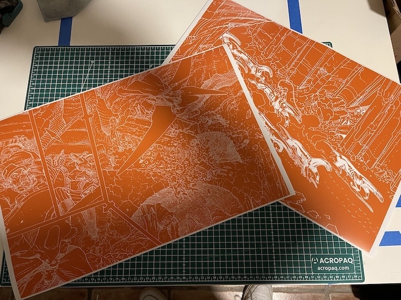 Pour la réalisation de ces gardes , j'ai fait appel à une boutique de reprographie qui a la machine qui va bien . Les dessins passés en vectoriel , il a pu faire une inversion en imprimant que le fond laissant les traits en blanc .