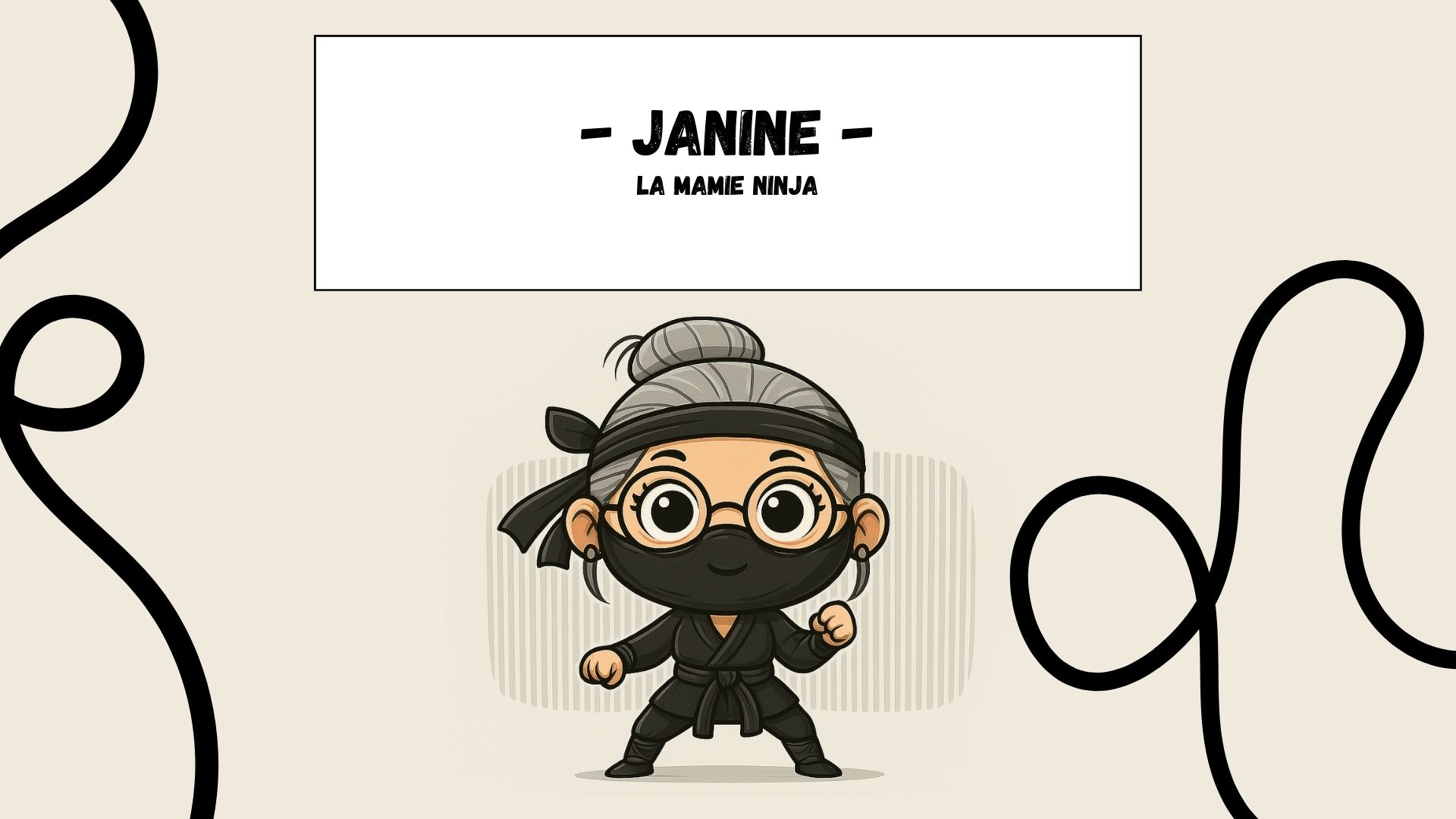 Voici le pitch :Janine, une grand-mère vive et rusée au passé mystérieux, reprend du service dans l’ombre pour protéger son petit-fils Lucas, un garçon qui attire un peu trop les ennuis. Ancienne ninja, elle agit sans jamais révéler sa véritable identité, épaulée par Calie, sa chienne bringée aussi discrète que malicieuse. Quand l’école devient un champ de bataille, Janine veille… sans que personne ne soupçonne la vérité.L’objectif : créer une série de tomes autour de situations scolaires et sociales dans lesquelles Janine intervient en douce.