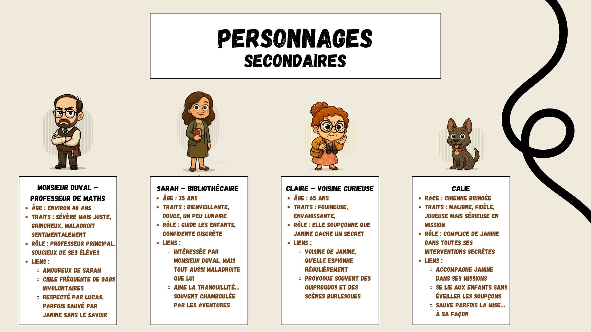 • Les 9 personnages (Lucas, Samia, Maxime, Thomas, Monsieur Duval, Sarah, Claire, Calie, et bien sûr Janine).