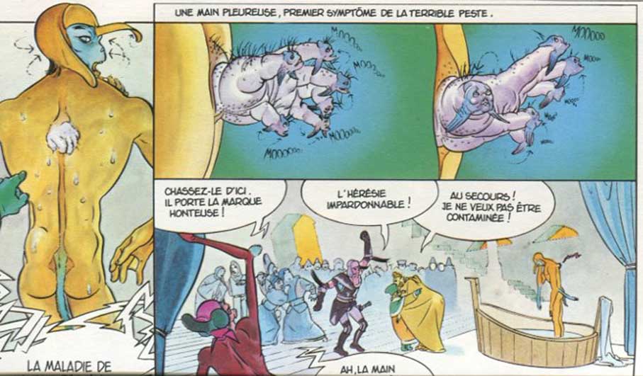 je recherche le titre d'une BD lue dans les années 90. Univers fantastique, très coloré. Et surtout je me rappelle que l'intrigue tournait autour d'une maladie qui affectait les personnages, des mains "poussaient" un peu partout sur leur corps...